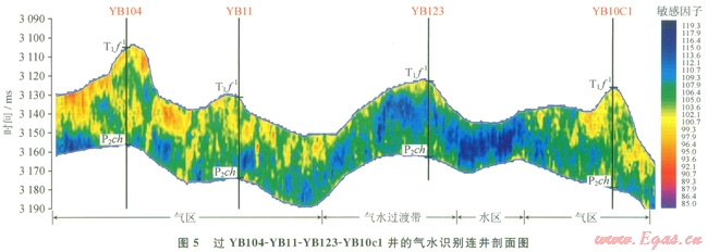 利用該技術(shù)完成了元壩氣田東部區(qū)域的氣水檢測,從識別的結(jié)果來看,與實(shí)鉆井的測試情況基本一致,也證實(shí)了該方法在該地區(qū)的有效性。圖5為該區(qū)過YBl04、YBll、YBl23、Ybl0cl井連井氣水識別剖面圖。其中YBl04測試獲得氣123×104m3/d,YBll測試獲得氣51×104m3/d,YBl23測試獲得氣5.3×104m3/d,水290m3/d,Ybl0cl測試獲得氣107×104m3/d,從圖5中可以看到,從產(chǎn)氣的YBl04井、YBll井到處于氣水過渡帶的YBl23井,穿過一段灘,間水區(qū)然后一直到產(chǎn)氣的YB10cl井,其氣區(qū)、水區(qū)分布帶及過渡帶清晰,與實(shí)鉆情況吻合好。