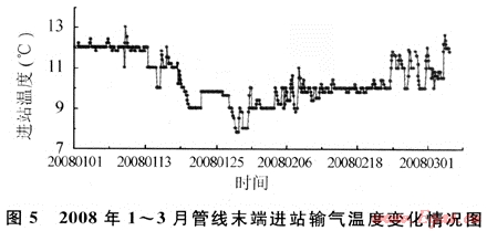 為保證該管線冬季不發(fā)生水合物堵塞,從2007年11月27日開始,作業(yè)區(qū)采用緩蝕劑加注泵間歇式加注乙二醇,每間隔2h加注1次,每次加注30min,每天加注50kg左右;該生產(chǎn)期間,平均氣溫為9.37℃,管線末端輸氣溫度在10~12℃。從2008年1月4日開始進行動力學抑制劑GHI-1現(xiàn)場試驗,采用連續(xù)式加注,白天(8:00~20:00)泵排量為21%,晚上(20:00~8:00)泵排量為25%,每天藥劑加量控制在13~16kg。此期間平均氣溫降至0~5℃,最低氣溫達-3℃,管線末端輸氣溫度在8~10℃。生產(chǎn)和試驗期間,藥劑加注量如圖3所示,管線輸氣量、首末兩端壓差、輸氣溫度等生產(chǎn)運行情況見表2和圖4、5所示。