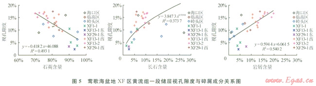 如圖5所示,XF區(qū)黃流組一段儲層的儲集性能與陸源碎屑成分關(guān)系密切,石英含量愈低、長石與巖屑含量愈高,視面孔率愈高。在黃流組一段沉積時期,源于昆嵩隆起XFl3-1氣田西部、XFl3-2氣田、XF29-l構(gòu)造西部砂巖,巖屑平均含量在11.8%~l6.2%,以巖屑石英砂巖為主,面孔率平均值為13.9%~l5.6%,以海南隆起物源為主的XFl3-1氣田東部、XF29-1構(gòu)造東部以及XFl-l氣田,各井砂巖石英平均含量大于90%,長石、巖屑含量低,分別為2.5%~3.8%、3.9%~7.7%,孔隙發(fā)育差,視面孔率僅為2.4%~7.0%(表1)。