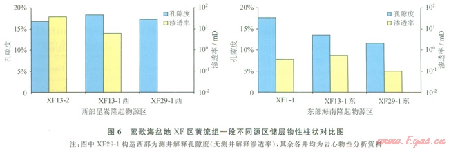 圖6也展示了由于物源區(qū)的不同造成儲集物性的差異。源于昆嵩隆起物源區(qū)的XFl3-2氣田、XFl3-1氣田西部、XF29-1構(gòu)造西部,巖心物性分析的孔隙度平均為16.8%~l8.3%,滲透率介于6.2~37.4mD,屬低、中滲型中等至好儲集層。而以海南隆起物源區(qū)為主的XFl-1氣田、XFl3-1氣田東部、XF29-1構(gòu)造東部諸井的儲層巖心孔隙度平均值為ll.7%~l7.6%、滲透率為0.1~0.5mD,屬低—特低滲型差儲集層或致密層,儲層質(zhì)量明顯劣于西部物源區(qū)。