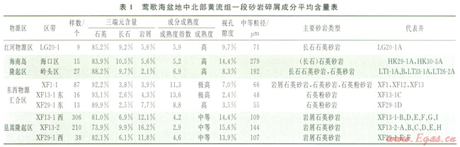 表1顯示,盆地中北部黃流組一段時期總體上以石英砂巖類為主,但不同區(qū)帶的長石、巖屑含量有差異。鶯東斜坡??趨^(qū)、嶺頭區(qū)長石平均含量介于9.7%~10.5%,巖屑平均含量介于2.8%~5.8%,以長石石英砂巖為主,反映以花崗巖為主的海南隆起區(qū)物源性質(zhì);西北部的LG20-1構(gòu)造,其石英、長石、巖屑含量與鶯東斜坡???、嶺頭區(qū)相近,仍以長石石英砂巖為主,但其粒度偏細(xì)(平均粒度中值為71mm),為極細(xì)砂,反映離物源區(qū)較遠(yuǎn),從其地理位置來看應(yīng)屬紅河物源體系;XFl3-2氣田、XFl3-1氣田西部、XF29-1構(gòu)造西部則以巖屑石英砂巖較為多見,巖屑平均含量介于11.8%~l6.2%(主要為片巖、千枚巖、變質(zhì)砂巖),中等成分成熟度,反映西部昆嵩隆起區(qū)含較多變質(zhì)巖類物源特征;而XFl、XFl2、XFl3、XFl3-1C、XF29-1D井砂巖,粒度細(xì)(粒度中值介于48~66mm),長石、巖屑含量低,平均含量分別為2.5%~3.8%、3.9%~7.7%,石英含量極高(大于90%),多為石英粉砂巖,成熟度指數(shù)介于8.8~13.6,屬高極高成分成熟度,反映這些井區(qū)沉積物經(jīng)過較長距離的搬運(yùn)。
