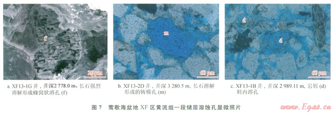 上述分析表明,XF區(qū)黃流組一段儲層除沉積相、成巖作用影響外[4],與物源區(qū)有密切關(guān)系的碎屑組分也是影響儲層質(zhì)量的一個關(guān)鍵因素。這是由于巖石在深埋過程中,石英組分穩(wěn)定,不易被酸性流體溶蝕,而長石、巖屑等不穩(wěn)定組分容易發(fā)生溶解,形成各種溶蝕孔(圖7),增加了儲集層孔隙性,同時因溶解作用強(qiáng)烈時形成伸長狀孔、超大孔可改造孔隙的連通性,提高儲集層滲透率[4]。