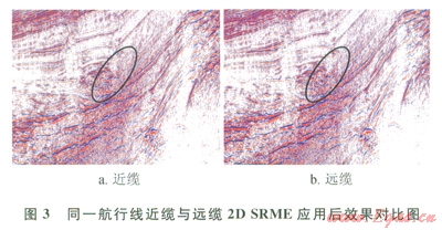 首先與傳統(tǒng)的2D SRME進(jìn)行比較。圖3是同一航行線近遠(yuǎn)纜使用2D SRME后的疊加,可以看到近纜2D SRME效果較好,而遠(yuǎn)纜效果則較差。這種現(xiàn)象可以從2D SRME的理論基礎(chǔ)來解釋,2D SRME技術(shù)是平面波褶積模型,它沒有考慮到多次波場(chǎng)的三維空間傳播,只有當(dāng)震源與拖纜在一條航行線上時(shí),2D SRME才會(huì)有較好的效果。現(xiàn)在的采集方式多為多纜采集,很難滿足2D SRME理論要求。3D SRME克服了2D SRME的技術(shù)缺陷,考慮了多次波場(chǎng)的三維空間傳播,一方面能模擬更多的多次波場(chǎng)(如繞射多次);另一方面,其模擬的多次波在空間位置更準(zhǔn)確,對(duì)于后續(xù)的匹配相減更重要。