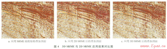 圖4為3D SRME與2D SRME的應(yīng)用效果??煽吹綉?yīng)用2D SRME后還殘留較多的多次波,而3D SRME衰減多次波的效果要好得多。