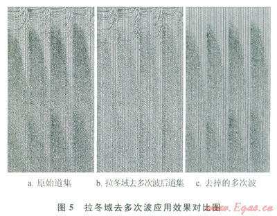 應(yīng)用3D SRME后,剩余了較多的長(zhǎng)周期多次波,3D SRME對(duì)該類型的多次波無能為力。拉冬域去多次波技術(shù)是應(yīng)用較早的很成熟的壓制該類型多次波的技術(shù),放在3D SRME后的CMP道集上處理。值得一提的是,拉冬域去多次波技術(shù)涉及道集在拉冬域的正反變換,很顯然,應(yīng)用3D SRME后的道集更適合于這種正反變換,可以減少高頻的海底相關(guān)多次在正反變換中的假頻現(xiàn)象。