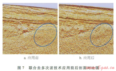 對(duì)多次波的衰減能力是評(píng)價(jià)一項(xiàng)去多次波技術(shù)的首要指標(biāo)。圖7-a為早期處理剖面,限于技術(shù)僅使用了2D SRME技術(shù)和拉冬域去多次波技術(shù)。圖7-b則使用聯(lián)合去多次波技術(shù)。圓圈標(biāo)注位置發(fā)育有較多的多次波。新資料多次波壓制效果好,硬基底以下的斷裂系統(tǒng)成像清晰,周邊地震和鉆井已經(jīng)證實(shí)斷裂是存在的。