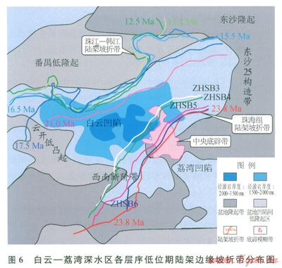 早先發(fā)生的南海運(yùn)動使白云凹陷最終在距今23.8Ma被充填均夷化,古珠江三角洲推進(jìn)到白云凹陷,陸架坡折帶發(fā)育在白云凹陷南坡。因此,在距今32.0~23.8Ma,白云凹陷發(fā)育了與珠一坳陷珠海組相似的淺海三角洲濱岸砂巖沉積組合。此時,深水沉積位于坡折帶下方的荔灣凹陷(荔灣凹陷在珠海組沉積中期先轉(zhuǎn)為深水沉積)。