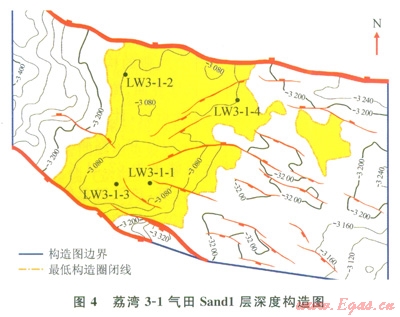 荔灣3-l構(gòu)造位于白云凹陷的東南部,處于南部隆起帶伸進(jìn)白云凹陷的鼻狀凸起上。該構(gòu)造靠近白云凹陷的中心位置,是一個在古近—新近系基底隆起七發(fā)育的受斷層控制的披覆背斜。受南部東西走向邊界大斷層的影響,該構(gòu)造至中中新世已經(jīng)成型,南部南掉大斷層和北部北掉大斷層形成構(gòu)造的南北邊界,東西兩側(cè)受披覆構(gòu)造控制。