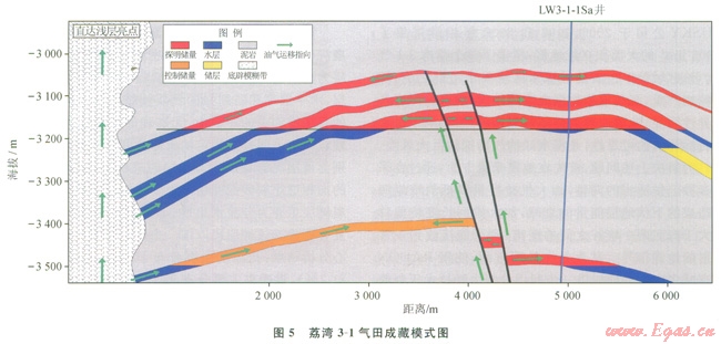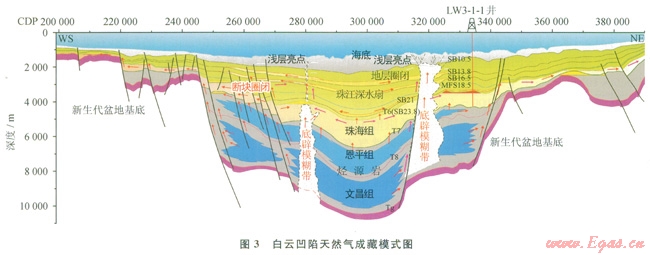 總體說來,荔灣3-1構(gòu)造是一個具有古基底高背景的晚漸新世淺海陸架三角洲體系、早中新世富砂深水扇體系下的斷裂—背斜—地層復(fù)合圈閉。其天然氣成藏聚集是近源晚期階段性累積成藏的產(chǎn)物。在中中新世以后(距今8~0Ma),主要來自白云凹陷主洼東部斜坡帶恩平組(現(xiàn)埋深在4600~6000m)有效烴源巖生成的天然氣,通過斷層和流體底辟向上進(jìn)行垂向運(yùn)移,然后沿區(qū)域砂體+不整合面+構(gòu)造脊綜合輸導(dǎo)體系進(jìn)行側(cè)向運(yùn)移,進(jìn)入荔灣3-1這個大型的以披覆背斜為主的斷裂背斜地層復(fù)合型圈閉,在上覆巨厚的新近系海相泥巖的封蓋下,形成荔灣3-1大氣田(圖5)。