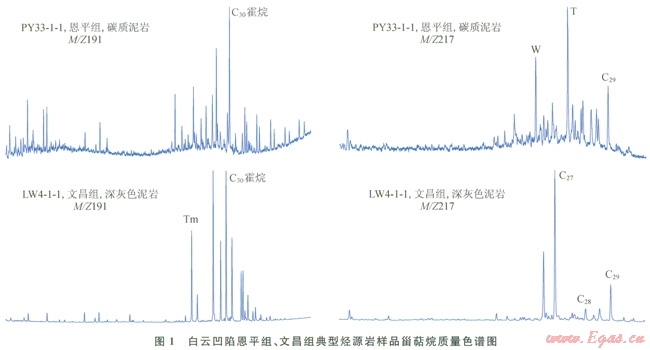 烴源巖樣品有機(jī)地球化學(xué)分析表明(表1、圖l),恩平組淺湖相、沼澤相烴源巖殘余有機(jī)碳含量(TOC)變化大(1.12%~56.18%),生烴潛力指數(shù)(Pg)較高(0.56~97.47mg/g);氫指數(shù)(HI)較低,介于50~300mg/g,有機(jī)質(zhì)類型為偏腐殖型干酪根;Pr/Ph為1.6~5.9,沉積環(huán)境變化大;C29規(guī)則甾烷優(yōu)勢,貧4-甲基甾烷系列;富含陸源三萜類生物標(biāo)志物,如W、T樹脂化合物含量高,奧利烷含量較低—中等。文昌組湖相烴源巖殘余有機(jī)碳含量適中(1.00%~2.50%),生烴潛力指數(shù)較高(8.18~l3.64mg/g);氫指數(shù)較高,介于446~566mg/g,有機(jī)質(zhì)類型為偏腐泥型干酪根;Pr/Ph為1.4~1.7,沉積環(huán)境為還原環(huán)境;與盆地北部珠一地區(qū)富生烴凹陷文昌組烴源巖特征不一樣,白云凹陷文昌組來源于藻類的C27規(guī)則甾烷含量較高,而貧4-甲基甾烷系列,推測當(dāng)時可能因處于不同的湖泊環(huán)境,其水生生物的種類也不同而導(dǎo)致;貧陸源三萜類生物標(biāo)志物,如W、T樹脂化合物和奧利烷含量低(或難于檢測)。烴源巖有機(jī)質(zhì)及生態(tài)組分中富含無定型和浮游藻類。