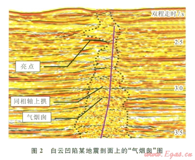 底辟構(gòu)造由地球深部物質(zhì)上拱或刺穿到淺部產(chǎn)生。在含油氣盆地中,流體底辟構(gòu)造是烴源巖垂向幕式排烴和油氣幕式成藏的一種特殊類型。在白云凹陷的地震剖面上發(fā)現(xiàn)了多個流體底辟帶,底辟的頂部到達(dá)淺部地層,最高處接近海底。流體底辟作用產(chǎn)生的“氣煙囪”呈直立、上小下大的煙囪狀,局部橫向擴(kuò)張呈囊狀、花狀,地震反射同相軸被明顯中斷,自身內(nèi)部反射較雜亂、模糊,甚至為空白反射(模糊帶),局部見同相軸上拱或下拉現(xiàn)象(圖2)。