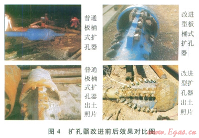 2)采用改進(jìn)型板桶式擴(kuò)孔器,提高了擴(kuò)孔效率,降低了施工風(fēng)險(xiǎn)(圖4)。采用新擴(kuò)孔器后,在Æ711mm-B管道穿越四級(jí)擴(kuò)孔施工中均是一次性完成了擴(kuò)孔,出土后的擴(kuò)孔器磨損很小,擴(kuò)孔效果極好。根據(jù)B管的擴(kuò)孔經(jīng)驗(yàn),在改進(jìn)擴(kuò)孔器切割方式的前提下,Æ711mm-A線進(jìn)一步優(yōu)化了擴(kuò)孔器水嘴的配置,使得鉆井液有效輔助切削,減小了擴(kuò)孔扭矩,將原來(lái)的四級(jí)擴(kuò)孔減少到三級(jí)(660.4mm、914.4mm、l066.8mm),提高了施工效率,節(jié)約了工期。