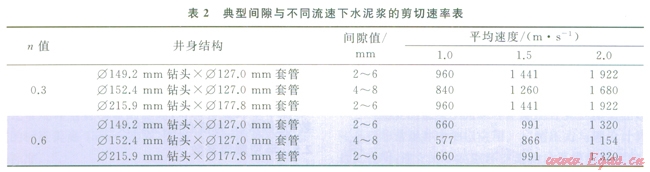 計算水泥漿流變參數(shù)通常使用旋轉(zhuǎn)黏度計f300與f100的讀值,其主要考慮到水泥漿在一般環(huán)空中的剪切速率在511s-l與l70s-1之間。但在小間隙環(huán)空中,水泥漿處于高剪切狀態(tài),剪切速率一般大于500s-1,表2給出了典型的環(huán)空間隙與不同流速下的水泥漿剪切速率值的比較情況。