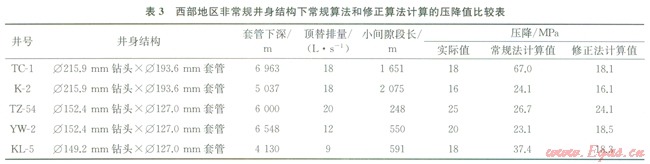 建立的小間隙注水泥環(huán)空流動計算模型在西部地區(qū)多口非常規(guī)井的注水泥平衡壓力設(shè)計計算中加以了應(yīng)用?,F(xiàn)場應(yīng)用結(jié)果表明:小間隙注水泥環(huán)空流動計算模型計算出的壓力值接近實際施工壓力值。表3為西部地區(qū)非常規(guī)井身結(jié)構(gòu)下采用常規(guī)算法和小間隙環(huán)空流動計算修正方法計算的壓降值和施工實際壓力值的比較情況。
