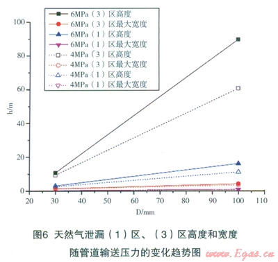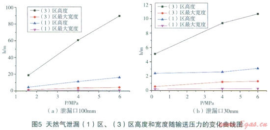 DN900在運行壓力6.0MPa,輸氣能力為74.3萬m3/h的高壓天然氣輸送管道(管壁厚度l0mm),埋地深度1.2m,泄漏點孔徑30mm時,天然氣泄漏口速度較大,屬超聲速天然氣氣流在空氣中的射流擴散,因此,在高度方向的擴散遠大于在水平方面的擴散。如圖4所示,在泄漏5s時,天然氣高度已達150m;25s天然氣已擴散至大于250m的高空;50s其在250m下的空間擴散形狀趨于定常,即形狀隨時間推移基本一致。圖5給出了泄漏口l00mm、30mm條件下天然氣泄漏(1)區(qū)、(3)高度和寬度隨輸送壓力的變化曲線圖。從模擬計算結(jié)果可以看出,隨著輸送壓力的增大,在相同泄漏口條件下,泄漏天然氣流量增大,導(dǎo)致(1)區(qū)、(3)高度和寬度增大。圖6給出了天然氣泄漏(1)區(qū)、(3)高度和寬度隨泄漏口直徑的變化趨勢圖,圖中表明:在相同輸送壓力下,泄漏口直徑增大,相當(dāng)于泄漏天然氣流量增大,導(dǎo)致(1)區(qū)、(3)高度和寬度增大。