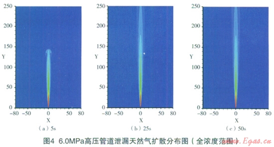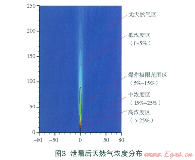 天然氣中高壓輸送管道泄漏后,無風(fēng)條件下,在大氣中以射流的方式存在(如圖3所示)。根據(jù)其爆炸性,可以分為4個區(qū)域:(1)高天然氣濃度區(qū):當(dāng)空氣中天然氣濃度達25%~30%時,可引起頭痛、頭暈、乏力、注意力不集中、呼吸和心跳加速、共濟失調(diào)。若不及時脫離,可致窒息死亡。當(dāng)濃度大于30%,在較短的時間內(nèi)就會窒息死亡;(2)中濃度區(qū)(15%~25%);(3)爆炸極限范圍區(qū)(5%~15%):在該濃度范圍內(nèi),遇熱源、明火或其它點火源有燃燒爆炸危險;(4)低天然氣濃度區(qū):