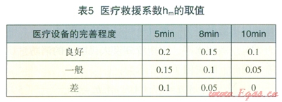 醫(yī)療機構(gòu)對燃氣事故的降災(zāi)作用,表現(xiàn)為醫(yī)療機構(gòu)到達現(xiàn)場的急救反應(yīng)時間和醫(yī)療設(shè)備的完善程度兩個方面。根據(jù)急救時對傷者的救治效果,表示醫(yī)療救援系數(shù)的取值見表5。