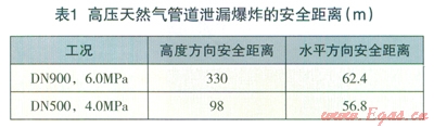 考慮到風(fēng)速以及環(huán)境條件對天然氣泄漏擴散的影響,高度方向保守安全系數(shù)為2,水平方向保守安全系數(shù)取為4,則高壓天然氣管道泄漏爆炸的最小安全距離如表l所示。而在天然氣泄漏點源的常年風(fēng)向下風(fēng)向位置,水平方向的安全距離則應(yīng)適當(dāng)增大。