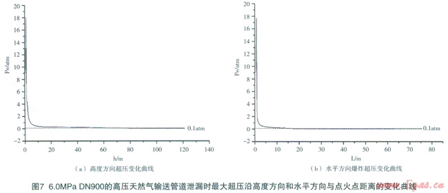 泄漏天然氣發(fā)生燃燒爆炸時,爆炸氣云將形成巨大破壞作用的爆炸超壓,當(dāng)超壓0.1atm時,就可造成橋梁、救生艇等破壞;當(dāng)超壓0.35atm時,可以將戶外人員吹走或埋入廢墟,具有50%的致命率,可嚴重破壞建筑物或工廠。通常以超壓0.1atm作為危險的臨界條件。圖7給出了DN900運行壓力6.0MPa,輸氣能力為74.3萬m3/h的高壓天然氣輸送管道泄漏點孔徑100mm,泄漏時間10min條件下,氣云爆炸最大超壓隨高度以及水平距離的變化曲線。圖中計算結(jié)果表明:在初始點火后,迅速形成爆轟,并達到約l8atm的超壓;隨著高度的增加,超壓先明顯衰減,隨后緩慢衰減,大約距地面66.5m高度超壓衰減至0.1atm。水平方向,在點火點附近,由于爆轟的存在,超壓高至約l8atm左右;隨著遠離點火點,超壓也是先明顯衰減,隨后緩慢衰減,在距離點火點l5.6m處,超壓降至0.1atm。