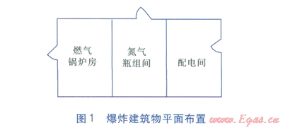 2012年6月某燃氣熱電廠發(fā)生爆炸,造成兩死一傷。爆炸地點位于燃氣電廠內的一座附屬建筑物(現(xiàn)澆框架式結構)內,爆炸建筑物平面布置見圖1。監(jiān)控錄像顯示,爆炸發(fā)生前有兩名人員先后進入配電間,2min后發(fā)生爆炸,爆炸沖擊波半徑超過30m。約l5min后消防及救援人員趕到現(xiàn)場,使用消火栓撲滅零星明火。事故現(xiàn)場勘察顯示,配電間3面外墻向外坍塌,建筑物內2面隔墻均向燃氣鍋爐房方向垮塌。配電間內有兩排配電柜,無超大型變壓器設備,多個配電柜門被炸飛,配電柜內有燒結痕跡。氮氣瓶、氮氣匯流管及安全放散管(放散口設置在室內)傾倒在燃氣鍋爐房與氮氣瓶組間之間的隔墻一側,放散口有積碳現(xiàn)象,放散口上方墻體有噴射火焰燃燒過的痕跡。