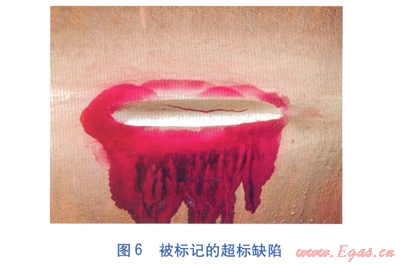 在特種設(shè)備檢測機構(gòu)對球罐全面檢測后,對超標(biāo)缺陷進行分析、標(biāo)記,球罐管理單位需對超標(biāo)缺陷進行返修,直至特種設(shè)備檢測機構(gòu)對返修后的缺陷檢測復(fù)核合格為止。超標(biāo)缺陷返修處理難度大,技術(shù)要求高,返修方案須經(jīng)過原設(shè)計單位或者具備相應(yīng)資質(zhì)的設(shè)計單位同意,是開罐檢驗過程中的最大難點。被標(biāo)記的超標(biāo)缺陷見圖6。