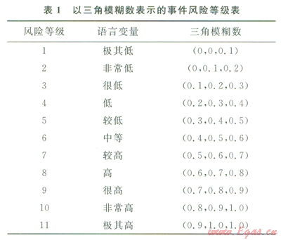 將引起燃?xì)夤艿佬孤┦录L(fēng)險(xiǎn)分為11個(gè)等級(jí)[8],相應(yīng)的語言變量及模糊數(shù)參照表l,語言變量可直觀表達(dá)風(fēng)險(xiǎn)因素的相對(duì)重要性。