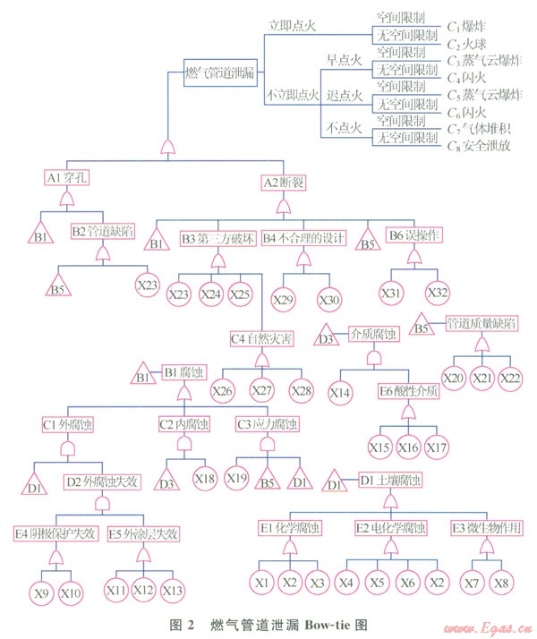 城市燃?xì)夤艿赖娘L(fēng)險(xiǎn)取決于管道失效的可能性和事故后果的嚴(yán)重性[3],為將燃?xì)夤艿朗鹿实那耙蚝蠊Y(jié)合起來進(jìn)行風(fēng)險(xiǎn)評(píng)價(jià),首次引入Bow-tie模型,將風(fēng)險(xiǎn)分析中的故障樹和事件樹聯(lián)系起來。Bow-tie模型最早出現(xiàn)在澳大利亞昆士蘭大學(xué)關(guān)于帝國(guó)化學(xué),工業(yè)公司危害分析的課程講義[4],隨后殼牌公司將其應(yīng)用于阿爾法鉆井平臺(tái)爆炸災(zāi)難分析中[5],至今這一技術(shù)已被廣泛應(yīng)用到一些重大事故。