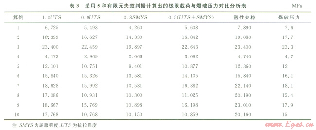 表3是采用5種失效判據(jù),即當(dāng)缺陷最深處沿壁厚方向中間節(jié)點(diǎn)的Von Mises等效應(yīng)力分別等于0.8UTS、0.9UTS、1.OUTS、0.5(UTS+SMYS)和塑性失穩(wěn)狀態(tài)時(shí)的管道內(nèi)表面所受壓力值為所得到的管道失效壓力。計(jì)算得出的極限載荷與真實(shí)爆破壓力進(jìn)行對(duì)比分析見圖4。