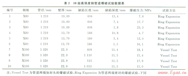 收集了10組含腐蝕缺陷的高強(qiáng)度管道的爆破試驗(yàn)數(shù)據(jù),本試驗(yàn)使用X80、Xl00高強(qiáng)度鋼材料[8-9],材料參數(shù)見表l。