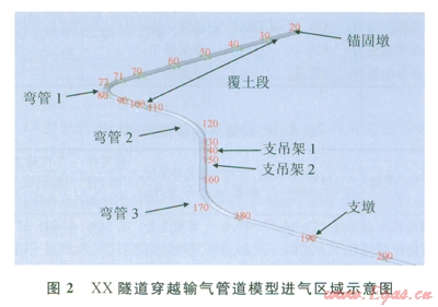 根據(jù)XX隧道穿越管道設(shè)計(jì)資料,隧道穿越的總長度為2246.7m,隧道內(nèi)全部采用露空與管架支撐形式,在隧道進(jìn)口和出口處分別設(shè)置錨固墩l和錨固墩3,用以截?cái)嗨淼劳夤艿缹λ淼纼?nèi)管道的影響。隧道進(jìn)口豎井深度為26.87m,支吊架2個(gè)(第1個(gè)支吊架距隧道進(jìn)口處5.4m),2個(gè)支吊架間距為2.816m;平巷長度為2160m,平巷內(nèi)設(shè)置支墩,支墩間距為l2m,共設(shè)置支墩l81個(gè);隧道出口豎井深度為18.32m,支吊架l個(gè)(距隧道出口處6.624m);管道彎管處的曲率半徑為6D(D為管道外徑)。管道的材料為L485,管徑為914mm,壁厚為22.2mm,彎管壁厚為23.8mm。根據(jù)式(1)計(jì)算得到試驗(yàn)壓力(pt)為21.2MPa。XX隧道豎井盾構(gòu)穿越輸氣管道具體布局如圖1所示。