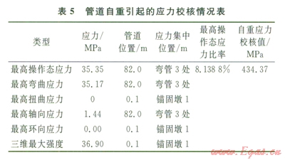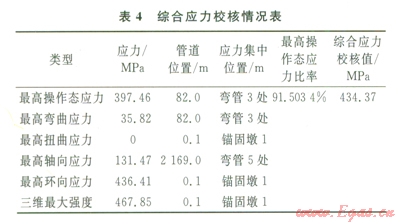 由表2~5可知,最高操作態(tài)綜合應(yīng)力產(chǎn)生在管道彎管3處,管道系統(tǒng)單元l70~180即管道76~82m處的最高操作態(tài)應(yīng)力為397.46MPa,最高操作態(tài)應(yīng)力比率為91.5034%,綜合應(yīng)力主要產(chǎn)生在彎管3處,一次、二次應(yīng)力及綜合應(yīng)力校核最高節(jié)點(diǎn)應(yīng)力均未超過434.37MPa,滿足管道的強(qiáng)度和柔性要求。