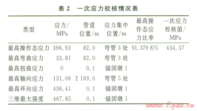 1)在試壓工況下的一次應(yīng)力和綜合應(yīng)力校核中,最大應(yīng)力產(chǎn)生的位置都在管道的彎管3處,產(chǎn)生最大二次應(yīng)力的位置在管道的彎管2處,說明彎管是應(yīng)力危險(xiǎn)截面處。