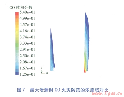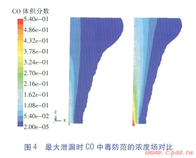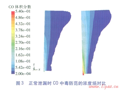 值得一提的是,火災(zāi)防范時只將爆炸極限列為危害區(qū)間,這符合不發(fā)生明火時的氣體冷態(tài)擴散情況,但一旦發(fā)生燃燒,C0的濃度場將發(fā)生極大變化,還將產(chǎn)生對人員窒息的煙氣。FLUENT作為一款功能強大的軟件,也能模擬燃燒情況(俗稱熱態(tài)研究),但這將大大增加參數(shù)設(shè)定的復(fù)雜性和計算過程冗時性,這是工程計算力求避免的,但應(yīng)是理論研究的改進方向。
