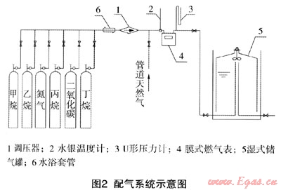 圖2為采用上述配氣方案時的流程示意圖。純組分氣體由鋼瓶減壓后,首先經(jīng)過水浴套管和減壓器,再經(jīng)膜式燃氣表計量,進入內(nèi)置攪拌器的5m,濕式儲氣罐。