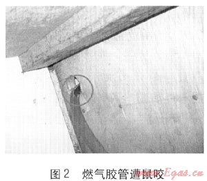 2010年11月5日,溫州市區(qū)康泰大廈一住戶廚房?jī)?nèi)發(fā)生一起燃?xì)獗ㄊ鹿?,造?人受傷、2戶建筑受損,爆炸原因系老鼠咬破膠管引發(fā)燃?xì)庑孤?。膠管被鼠咬是用戶家中安全用氣的最大隱患之一,每年冬春兩季鼠患最為嚴(yán)重。統(tǒng)計(jì)數(shù)據(jù)顯示,2009年公司供氣區(qū)域內(nèi)發(fā)生230起有關(guān)膠管隱患處警,其中膠管被鼠咬有76起;2010年共發(fā)生有關(guān)膠管隱患處警200起,其中膠管被鼠咬有93起,進(jìn)而發(fā)生爆燃的有5起。通常用戶家里所使用的燃?xì)饽z管為橡膠軟管,易被鼠咬(見圖2),用戶在不知道的情況下開啟灶具開關(guān)就會(huì)產(chǎn)生爆炸、爆燃等事故。