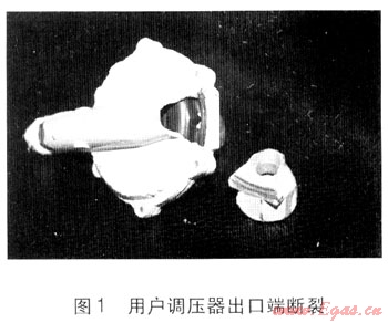 調(diào)壓器本體泄漏,包括本體進(jìn)出口端開裂、斷裂(見圖1)、閥蓋破裂、本體與螺紋接頭處泄漏等。調(diào)壓器本體所用材質(zhì)主要是生鋁,韌性不足,閥體厚度(約2mm左右)不足,制造工藝缺陷造成調(diào)壓器本身質(zhì)量問題;其次,本體與螺紋接頭采用金屬膠粘合連接,其強(qiáng)度較低,如果安裝人員沒有正確安裝操作,會(huì)導(dǎo)致粘合部位受損或嚴(yán)密性達(dá)不到要求;再次,由于采用硬連接,隨環(huán)境溫度變化和建筑物沉降,調(diào)壓器連接處發(fā)生伸縮彎曲而受應(yīng)力作用,從而造成泄漏。