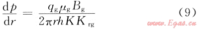 在模型所示的穩(wěn)定流過程中,基于達(dá)西定律的氣井徑向壓力降為: