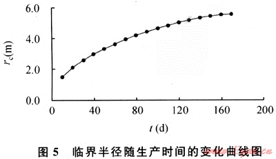 計(jì)算的臨界半徑隨時(shí)間推移曲線如圖5。表明生產(chǎn)時(shí)間越長臨界半徑越大,水相蒸發(fā)的影響范圍越深,但是當(dāng)生產(chǎn)時(shí)間超過一定值后(120d),臨界半徑趨于定值,水相蒸發(fā)作用逐漸變緩。