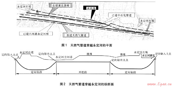 天然氣管道穿越永定河的平面及縱斷面見(jiàn)圖1、2。