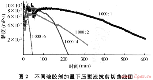 為了在流變儀器上盡量模擬高剪切,做剪切實驗時首先在900s-1下剪切1min,然后再做170s-1下的剪切。圖2是廣安002-X36井不同破膠劑加量下壓裂液抗剪切的實驗結(jié)果,結(jié)果表明壓裂液能滿足超大規(guī)模加砂壓裂的耐剪切的要求。