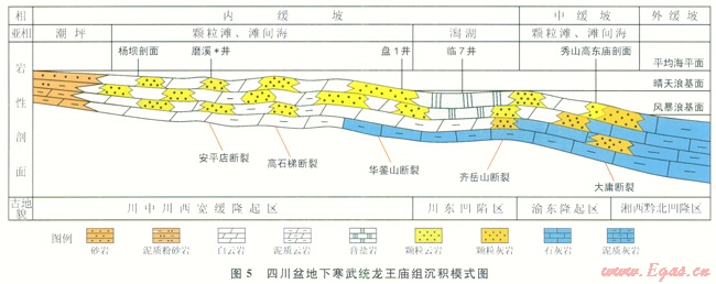 龍王廟期從盆地的西部到奉節(jié)—石柱—三匯—古藺一線發(fā)育內(nèi)緩坡相。盆地內(nèi)陸源物質(zhì)含量少,僅在盆地西部和西北部有少量沉積,發(fā)育潮坪亞相,主要巖性為紫紅色、褐灰色、灰色泥巖、砂巖,深灰色泥質(zhì)云巖、泥質(zhì)泥晶云巖,沉積動力以潮汐的作用為主,能量一般不強;川東凹陷區(qū),屬于內(nèi)緩坡的低洼地帶,因受兩側(cè)隆起區(qū)阻擋作用,水體循環(huán)不暢,以靜水沉積為主,鹽度略高,局部地區(qū)甚至出現(xiàn)咸化和蒸發(fā)作用,巖性以灰色、深灰色泥粉晶云巖、含泥質(zhì)條帶泥晶云巖為主,部分地區(qū)發(fā)育膏巖、鹽巖(如臨7井);川中川西寬緩隆起區(qū),是內(nèi)緩坡顆粒灘發(fā)育的主要地區(qū)。隆起區(qū)地形相對較高,在波浪、潮汐的作用下,水體能量較強的位置發(fā)育顆粒灘,巖性以灰色、深灰色亮晶砂屑云巖、殘余砂屑云巖、殘余礫屑云巖,以及細晶云巖為主,見少量鮞粒云巖及生屑云巖,交錯層理發(fā)育,為顆粒灘亞相;在整個隆起區(qū),顆粒灘亞相與灘間海亞相具體發(fā)育區(qū)域很難加以區(qū)分,在橫向上多表現(xiàn)為灘間海發(fā)育于顆粒灘之間,縱向上夾于大套顆粒灘之間。灘間海亞相水體環(huán)境相對安靜,以細粒沉積為主,由生物擾動泥晶云巖、含不規(guī)則泥質(zhì)紋層泥晶云巖和扁條狀泥晶云巖組成,發(fā)育條帶狀構(gòu)造、生物擾動斑、生物潛穴構(gòu)造等是該亞相的典型特點。