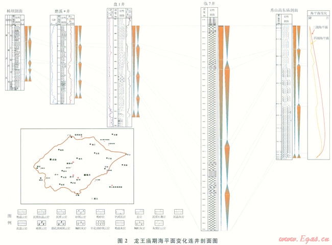 碳酸鹽巖沉積作用對相對海平面變化的響應(yīng)極為敏感,相對海平面升降發(fā)生變化,沉積巖性就有所不同,表現(xiàn)出不同的旋回序列[28]。為此,選取3 口井進行巖心觀察并踏勘實測2條野外剖面,對龍王廟組沉積巖性組合進行了分析,劃分單井、野外剖面沉積旋回,對連井剖面上的沉積旋回進行橫向?qū)Ρ?,以此來反映海平面的變化情況(圖2)。如圖2所示,整個龍王廟期海平面都具有快速海侵、低速海退的特點,次級海平面變化特征也一致。