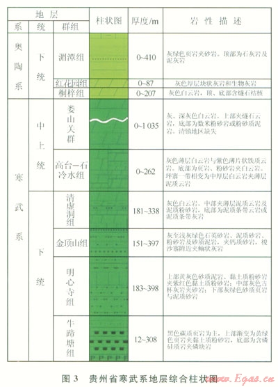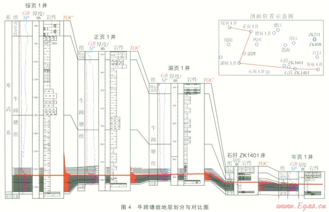 1)貴州省下寒武統(tǒng)牛蹄塘組主要分布于黔北、黔中及黔東 黔東南地區(qū),頁巖層段位于牛蹄塘組下部,巖性主要為含粉砂一粉砂質、碳質泥巖頁巖。