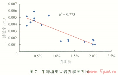 該區(qū)牛蹄塘組頁巖孔隙度為1.3%~25.6%,平均為8.24%,孔隙度中等;滲透率介于0.001~0.017mD,平均為0.008mD,滲透率極低。牛蹄塘組頁巖孔隙度與滲透率之間呈線性負相關關系,如圖7所示。