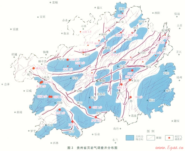 為改善能源結構,改變貴州省“無油少氣”的局面,貴州省人民政府于2012年3月開展了貴州省頁巖氣資源調查評價項目,針對貴州省黑色頁巖目的層,施工了27口調查井(圖2)。本文的主要數據即來源于《貴州省頁巖氣資源調查評價報告》,所公布的數據為將國內有資質的測試單位與國外測試機構提供的數據比較修正后的結果。