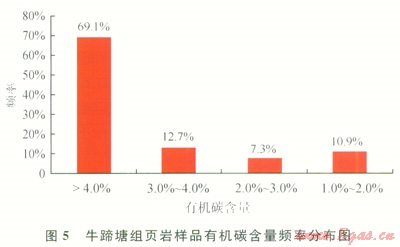 牛蹄塘組干酪根有機顯微組分以腐泥無定型和腐殖無定型為主,前者相對豐度為11%~92%,平均為49%;后者相對豐度為8%~85%,平均為48%。干酪根類型指數為51~96,干酪根類型以腐泥型和偏腐泥混合型為主。綜合分析認為:貴州省牛蹄塘組含氣頁巖的母源主要為藻類等低等水生生物,生烴能力較強。通過對牛蹄塘組地表露頭和鉆孔巖心樣品的有機碳含量測試,發(fā)現頁巖有機碳含量范圍為0.7%~14.6%,平均為5.2%,主頻在大于4.0%的區(qū)間(圖5)。