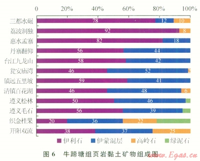 該區(qū)牛蹄塘組頁巖石英、長石等碎屑礦物含量為24%~88%,平均為72.3%;自生脆性礦物含量為0~62%,平均為8.6%;黏土礦物含量介于l2%~30%,平均為19.0%。黏土礦物以伊利石和伊蒙混層為主,綠泥石較少見(圖6)。巖石礦物學特征表明:頁巖儲層脆性礦物總體含量高,具有較好的破裂潛力,預測開發(fā)過程中可取得較好的儲層改造效果[12]。