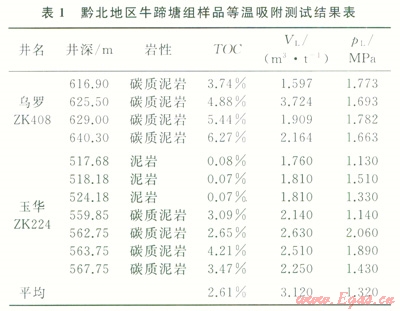 仁頁l井飽和吸附量VL介于0.68~7.17m3/t,差異較大,平均為3.05m3/t;pL在1.04~2.48MPa,平均為1.98MPa。5個樣品中飽和吸附量超過3m3/t的有2個,介于2~3m3/t的有l個,其余2個樣品為0~1m3/t,反映了牛蹄塘組頁巖物性縱向上存在較大差異。等溫吸附氣量比現場解吸所獲得的總氣量大得多的事實也在一定程度上說明,牛蹄塘組黑色頁巖儲氣能力并不太差,在地下溫壓條件適合的條件下有可能賦存大量的頁巖氣資源[14]。