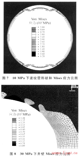 4) 井壁只在波紋管與其最先接觸的點(diǎn)以及隨后接觸的波峰頂點(diǎn)處會出現(xiàn)較高的Mises應(yīng)力。