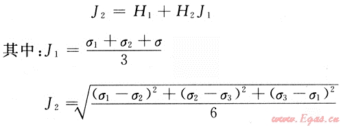 D-P系列屈服準(zhǔn)則是Von-Mises強(qiáng)度準(zhǔn)則的推廣。Von-Mises準(zhǔn)則認(rèn)為,八面體剪應(yīng)力或平面上的剪應(yīng)力分量達(dá)到某一極限值時(shí),材料開始屈服,在主應(yīng)力空間Mises準(zhǔn)則是正圓柱面,但巖石具有內(nèi)摩擦性。因此,D-P強(qiáng)度準(zhǔn)則在主應(yīng)力空間是圓錐面[7~8]。其形式為:
